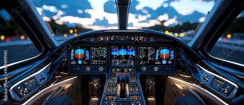 A detailed cockpit view showcasing advanced aviation technology and instruments against a stunning twilight sky.