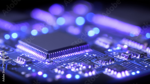 A detailed electronic board with illuminated components representing modern circuitry and technological infrastructure.