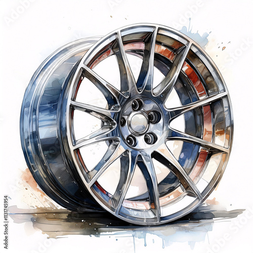 A detailed illustration of a shiny chrome alloy wheel with a multi-spoke design, reflecting light on a white background with watercolor splashes