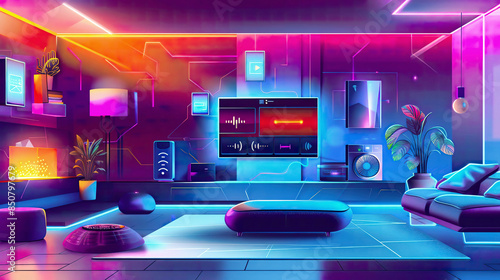 A detailed illustration of a smart home interface casing an AR view of IoT objects in a contemporary interior a stylish living room with visible IoT devices
