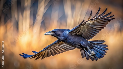 A detailed image of a raven in flight , Raven, black bird, wings, feathers, flying, wildlife, nature, sky, majestic, birdwatching