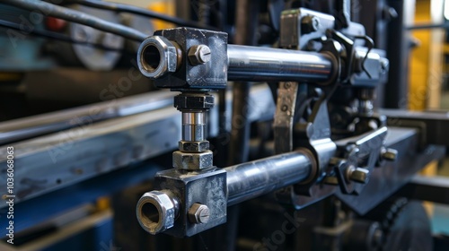 A detailed look at a forklift's lifting mechanism, with hydraulic pistons and metal arms, Industrial setting with precision engineering