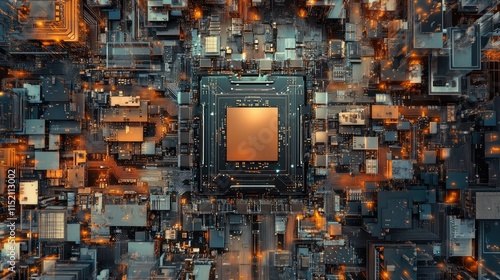 A detailed photo of an AI microchip surrounded by circuits, showcasing the advanced design of its neural network pathways
