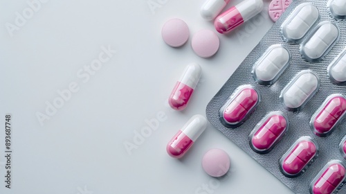 A detailed photo of pink and white pills arranged on a plain white background, accompanied by empty silver blister packaging on the side. The simple and uncluttered composition highlights the pills,