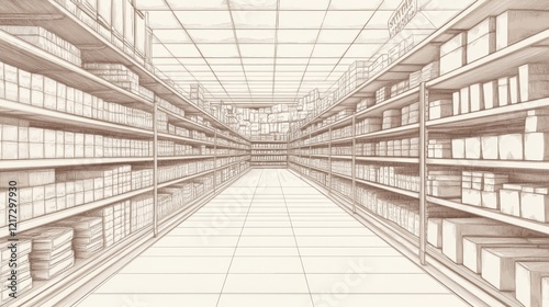 A detailed sketch of an organized warehouse aisle filled with neatly stacked boxes and shelves
