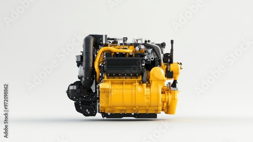 A detailed view of a powerful industrial engine, showcasing its unique design and vibrant yellow color against a plain background.