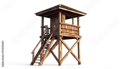 A detailed wooden observation tower with stairs, open windows, and a slanted roof