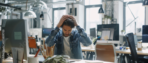 A determined man at his desk in a well-lit office setting, focused on detailed architectural blueprints displayed on a large monitor.
