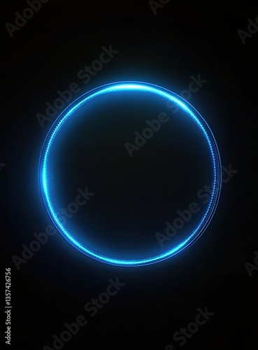 A digital art illustration of a glowing blue ring with tiny light dots around it, dark background, cool lighting, sci-fi style with a mysterious and futuristic atmosphere