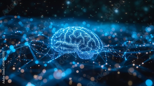 A digital brain made of glowing blue lines and dots, surrounded by an array of interconnected nodes representing artificial intelligence.