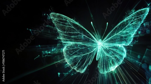 A digital butterfly with intricately detailed wings radiates an enchanting light amidst a dark background, symbolizing hope, transformation, and creative brilliance.