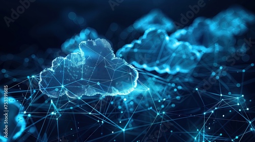 a digital data cloud network composed of interconnected nodes, with each node emitting a soft glow to represent data transfer symbols, symbolizing cloud computing and connectivity.