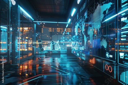 A digital finance hub with holographic data visualizations, virtual trading floors, and AI investment advisors.