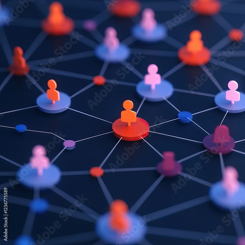 A digital network of colorful figures representing connections and interactions among individuals in a social or professional context.