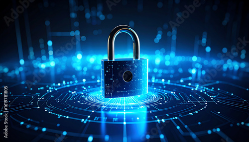 A digital padlock glows against a futuristic background, symbolizing cybersecurity and data protection in a technologically advanced world