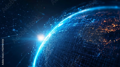 A digital rendering of a glowing blue and orange earth with a network of lines connecting it.