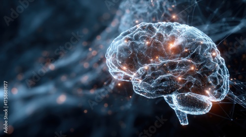 A digital representation of a human brain with interconnected neural networks and glowing nodes against a dark background, symbolizing intelligence and technology.