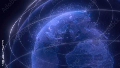 A digital representation of blue Earth with glowing lines encircling the planet, highlighting global connectivity and technology