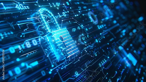 A digital representation of cybersecurity, featuring a padlock and data streams.