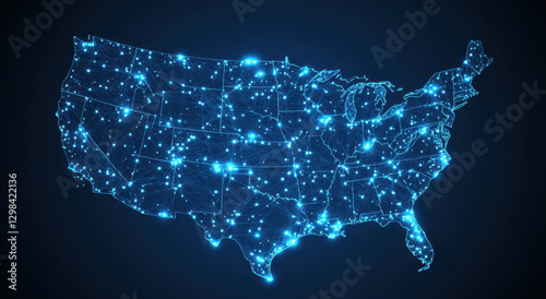 A digital representation of the United States displays glowing connections across the country, emphasizing digital networks and information flow