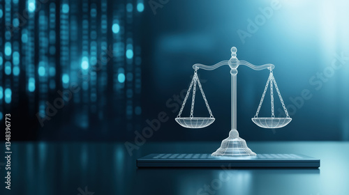 A digital scale symbolizes justice, with a modern background featuring binary code, representing the intersection of law and technology.