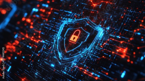 A digital shield icon with a padlock, symbolizing cybersecurity and data protection.
