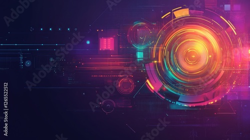 A digital transformation background with floating elements and neon lights.