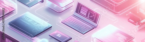 A digital workspace featuring laptops and books, showcasing technology and coding.