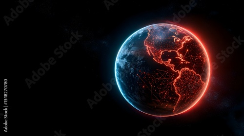A digitally enhanced image of Earth, centered on the Americas, shows a network of glowing red lines connecting cities, superimposed on a dark blue and red globe against a black space background.