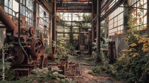 A dilapidated building with a rusty old engine and a lot of greenery. Scene is eerie and abandoned