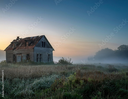A dilapidated farmhouse stands alone in a misty field at sunrise.