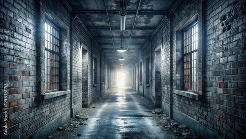 A dimly lit, long corridor within an aged brick building, featuring windows and overhead lighting, creating an atmosphere of mystery and suspense