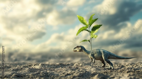 A dinosaur toy with a plant growing in an outdoor setting