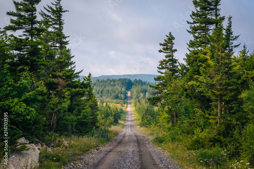 A dirt road and pine trees in Dolly Sods Wilderness, Monongahela National Forest, West Virginia.