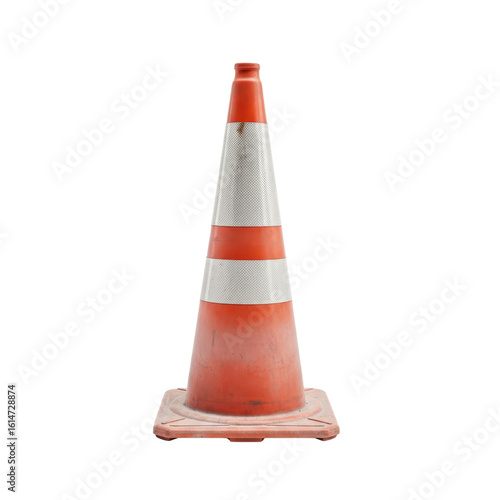 A dirty orange traffic cone with reflective stripes isolated on white isolated on transparent background