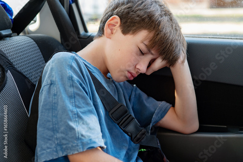 A disgruntled, half-asleep teenager leans against the window in the back seat of a car