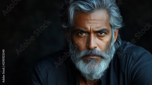 A distinguished man with a silver beard and intense gaze sits against a dark background. His expression conveys depth and thoughtfulness, showcasing character and experience