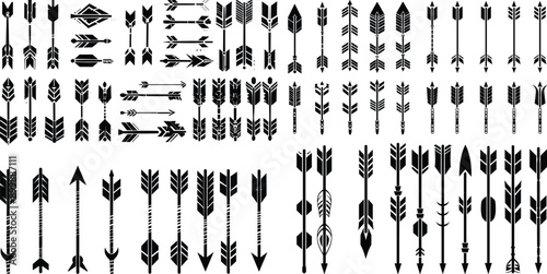 A diverse collection of black silhouette vector arrows, featuring various styles and designs. This set includes traditional, modern, and decorative arrows, ideal for graphic design projects, logos, an