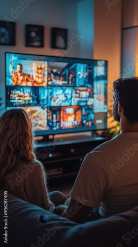 A diverse couple enjoys a cozy evening at home, relaxing as they stream their favorite shows on a large television