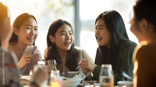 A diverse group of Asian women friends sit around a table to talk, gossip and chat. They are from multiple ethnicities and are smiling and laughing as they converse in a relaxed, easy : Generative AI