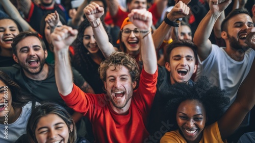 A diverse group of fans, filled with excitement, cheer with their arms raised high. Their jubilant expressions and enthusiastic gestures convey the thrill of a momentous sporting event