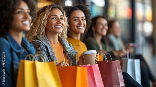 A diverse group of friends sitting in a cafe happily sharing their Pay Day plans while sipping on coffee surrounded by shopping bags Large space for text in center Stock Photo with copy space
