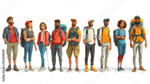A diverse group of nine young adults dressed casually, standing side by side, some carrying backpacks and outdoor gear, ready for an adventure or travel.
