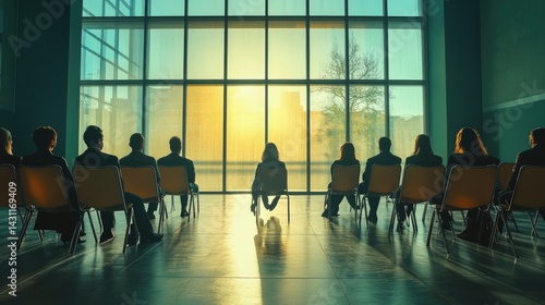 A diverse group of professionals sits attentively in a modern conference room, facing forward.