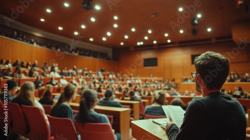 A diverse group of students is focused on the lecturer in a spacious auditorium. The warm lighting creates an inviting atmosphere for learning