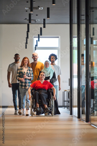 A diverse group of young business people walking a corridor in the glass-enclosed office of a modern startup, including a person in a wheelchair and a woman wearing a hijab
