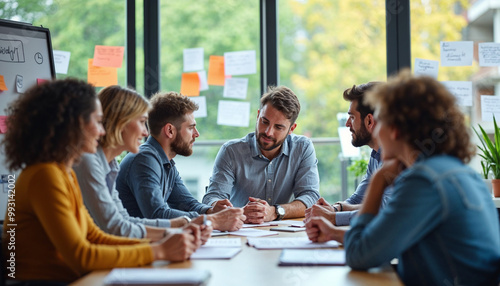 A diverse team brainstorms in a bright glass office filled with sunlight and collaboration.