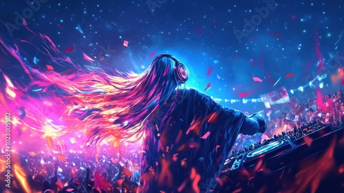 A DJ performs at a vibrant music festival, surrounded by an energetic crowd and colorful lights.