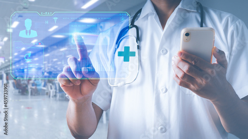 A doctor examines a 3D monitor that displays blood pressure readings. Blood components, heart rate The tablet's display is based on the app. Background of a hospital with a blurred interior.