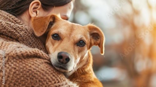 A dog being embraced by a person, set against an outdoor backdrop with autumnal colors.